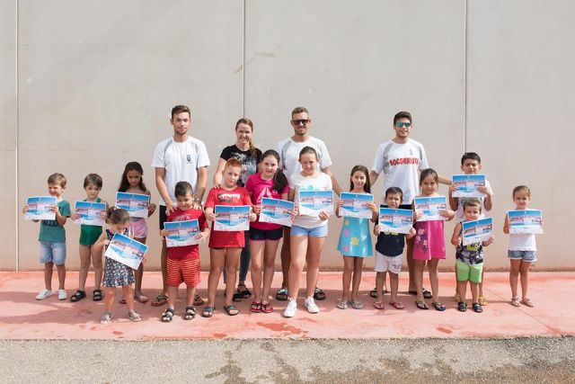 Cerca de 150 alumnos han completado este verano los cursos de natación municipales que ha organizado la Concejalía de Deportes del Ayuntamiento de Mazarrón. Este jueves han recibido su diploma acreditativo los participantes del tercer y último grupo. La actividad se ha desarrollado en las instalaciones del colegio Siglo XXI de Puerto de Mazarrón. La concejal de Familia, Laura Ortiz, ha acompañado a los inscritos en su último día de aprendizaje.