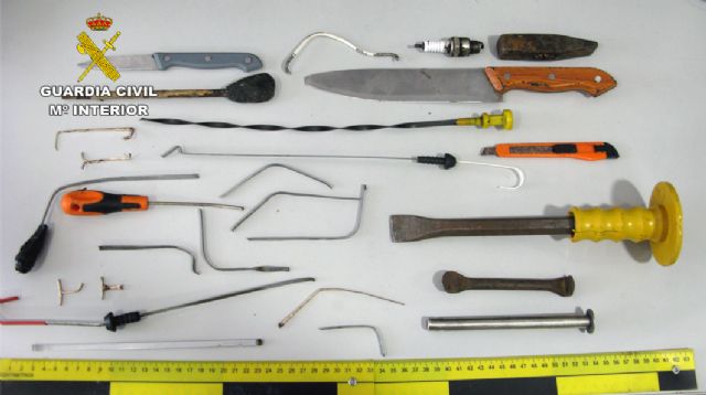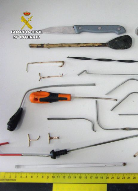 Durante la detención, los guardias civiles se incautaron de numerosos objetos de diferente tipo destornilladores, cuchillos, cúters, varillas metálicas y cinceles entre otros supuestamente utilizados para llevar a cabo su actividad delictiva. Además se recuperó la motocicleta con la que circulaba en el momento de la detención, la cual figuraba como sustraída y había sido utilizada en la comisión de los robos.