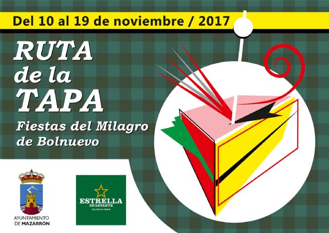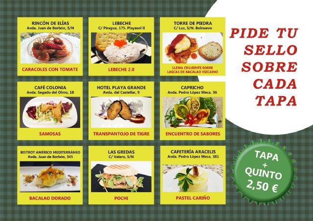 El próximo viernes comienza la Ruta de la Tapa de las Fiestas del Milagro de Bolnuevo. Nueve establecimientos ofrecerán sus mejores aperitivos del 10 al 19 de noviembre desde su horario de apertura hasta el cierre. Cada uno de los locales participantes tendrá a disposición del cliente un pasaporte para rellenar. Quienes completen la ruta optarán al sorteo de un carro de compra valorado en 100 euros y quienes completen al mínimo un número de 6 sellos podrán participar en el sorteo de consumiciones y degustaciones para dos personas en los nueve locales participantes.