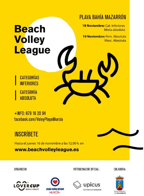 Durante la jornada del sábado competirán las categorías inferiores sub 13, sub 15, sub 17 y categoría mixta absoluta y para el domingo está prevista la competición en categoría absoluta masculina y femenina. Las inscripciones se mantienen abiertas hasta el jueves 16 de noviembre en la web www.beachvolleyleague.es y en la página de facebook Club Voley Playa Murcia.