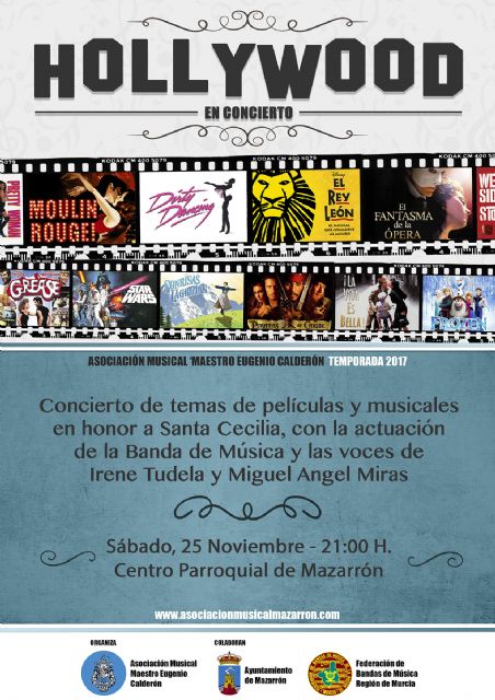 'Hollywood en Concierto' será el segundo de los conciertos y correrá a cargo de la Banda de Música junto a las voces de Irene Tudela y Miguel Ángel Miras. Este concierto tendrá lugar en el Centro Parroquial de Mazarrón el sábado, 25 de noviembre a las 21:00.