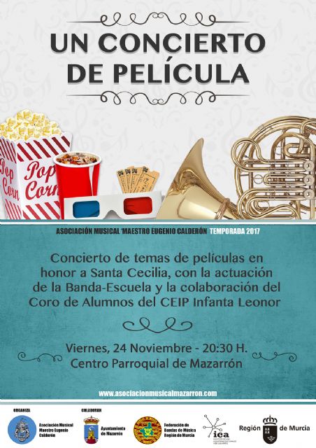 Con motivo del día de Santa Cecilia, patrona de la Música, la Asociación Maestro Eugenio Calderón, con la colaboración del Ayuntamiento de Mazarrón, ha programado dos conciertos en los que se interpretarán conocidas bandas sonoras cinematográficas. El primero de ellos, bajo el título 'Un concierto de película' tendrá lugar el próximo viernes, 24 de noviembre, a las 20:30 horas en el Centro Parroquial de Mazarrón. Este concierto contará con la actuación de la Banda-Escuela de la Asociación y con la colaboración de un coro de alumnos del CEIP Infanta Leonor de Mazarrón. Organizado por la Asociación Musical, el concierto contará la financiación del Ayuntamiento de Mazarrón y el ICA (Instituto de las Industrias Culturales y de las Artes de la Región de Murcia) dentro del proyecto 'Música en familia'.