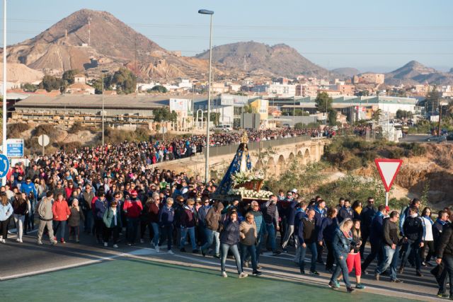 Tras la misa de primera hora, la Virgen del Milagro salía de la iglesia de San Andrés de Mazarrón acompañada por los primeros romeros que hacían frente al frío de la mañana. La alcaldesa de Mazarrón, Alicia Jiménez, asistía en el templo a los primeros trovos que dirigían a la Santísima Madre los miembros de la Asociación Virgen del Milagro. En su recorrido por las calles de Mazarrón, se iban sumando más fieles a un río humano que se dirigía hacia el puente de las Moreras, donde poco después tenía lugar la primera parada. Al avance de la romería el tiempo mostraba su bonanza ofreciendo imágenes de gran belleza en las que cada vez más se veía a más romeros que cumplían con la tradición de caminar junto a la Virgen al pie de la sierra que separa Mazarrón de Bolnuevo.