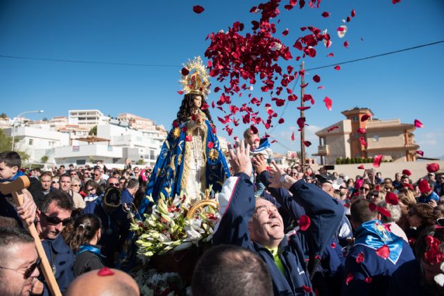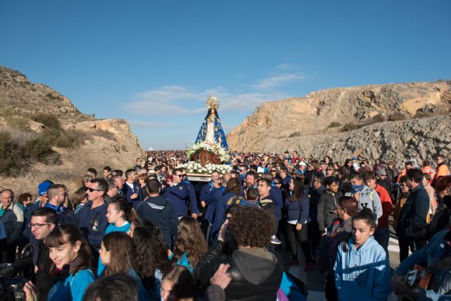 Miles de fieles y visitantes participan en una multitudinaria romería que culmina en la playa de Bolnuevo entre trovos, cánticos y vítores a la Purísima