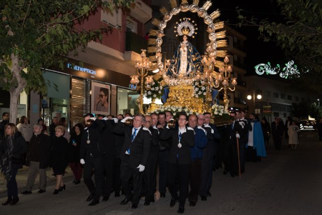 Ya por la tarde tuvo lugar la procesión con la imagen de la Patrona. El cortejo partió del Santuario acompañado por la Banda de Tambores y Cornetas, seguido de la Agrupación de Infantes y el estandarte de la Purísima. Por delante del trono marchaban vestidas de manolas la reina de las fiestas, Estefanía Graciela Granda y sus damas de honor, así como la reina infantil, Ángela Ortiz y su cortejo. También, una representación de los alcaldes pedáneos portando los hachotes pertenecientes a cada una de las pedanías. Mazarroneros y mazarroneras alumbrando a la Virgen en una tarde apacible en la que la Patrona lució su trono de flores blancas por las calles de Mazarrón. Cerraban el cortejo las autoridades religiosas, civiles y por último la banda de la Escuela Maestro Eugenio Calderón.