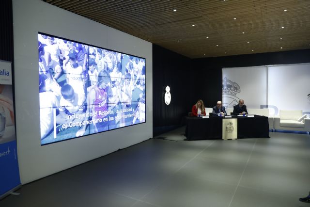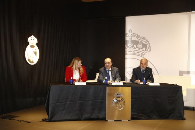 Julio González Ronco, director gerente de la Fundación Real Madrid; la alcaldesa de Mazarrón, Alicia Jiménez; y Ricardo Gallego, embajador del Real Madrid, rubricaron esta mañana en el Santiago Bernabéu el acuerdo de colaboración entre el consistorio murciano y la Fundación Real Madrid, que cumple cinco temporadas de fútbol educativo e integrador.