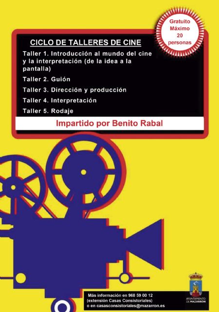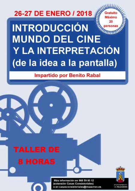 La Concejalía de Cultura del Ayuntamiento de Mazarrón vuelve a programar para este año 2018 un nuevo ciclo gratuito de talleres cinematográficos impartido por el cineasta Benito Rabal en Casas Consistoriales. La actividad, que agotó todas sus plazas en su primera edición de 2017, ha sido presentada este martes por el concejal de Cultura, Pedro Martínez y por el propio Benito Rabal. Este nuevo ciclo engloba cinco talleres que desembocarán en la realización y producción de un cortometraje. El primero de los talleres titulado "Introducción al mundo del cine y a la interpretación" tendrá lugar los días 26 y 27 de enero en horario de 17:00 a 21:00 horas el primer día y de 10:00 a 14:00 horas el segundo. Existe un máximo de 20 plazas y el plazo de inscripción ya se encuentra abierto. Las solicitudes se pueden formular en el correo electrónico casasconsistoriales@mazarron.es