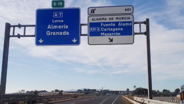 La Autovía del Mediterráneo (A7) muestra desde principios de año el destino “Mazarrón” en la salida 601 a la altura de Alhama de Murcia. Este punto conecta con la RM2 que comunica con Cartagena y sirve de enlace con la RM23 hacia Mazarrón. Esta salida en la A7 se complementa con otra posterior, situada varios kilómetros más adelante en dirección Andalucía, a la altura de Totana que enlaza con la RM3 con destino también a Mazarrón.