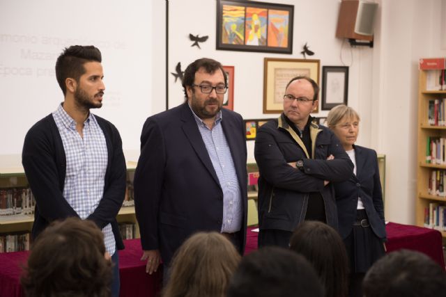 Pedro Martínez y Patricio Sánchez, concejales de Cultura y Educación del Ayuntamiento de Mazarrón, han inaugurado este lunes la Semana Cultural que organiza el IES Felipe II. Se trata de unas jornadas que cumplen su novena edición en las que se acerca el patrimonio de Mazarrón al alumnado, tal y como ha afirmado el director del centro, Andrés Piña, minutos antes de la conferencia que ha impartido la arqueóloga municipal, María Martínez, sobre "Los barcos fenicios y la época prerromana en Mazarrón". El programa de la Semana Cultural incluye charlas, visitas guiadas y conciertos musicales.