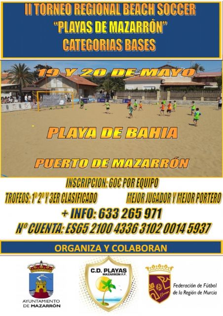 El II Torneo Beach Soccer "Playas de Mazarrón" tiene nueva fecha. La playa de Bahía acogerá el sábado 19 y el domingo 20 de mayo. La cita es organizada por el Club Deportivo Playas de Mazarrón en colaboración con la Federación de Fútbol de la Región de Murcia y el Ayuntamiento de Mazarrón.