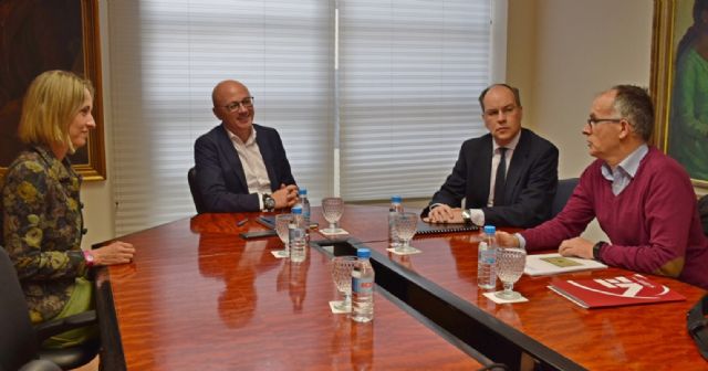 El consejero de Empleo, Universidades y Empresa, Juan Hernández, acompañado por la directora general de Energía y Actividad Industrial y Minera, Esther Marín, se reunió hoy con el decano del Colegio de Ingenieros de Caminos, Manuel Jódar, y con el exvicerrector de la UPCT e ingeniero de Minas Emilio Trigueros, para analizar posibles soluciones visuales para la mina San Cristóbal II de Mazarrón.