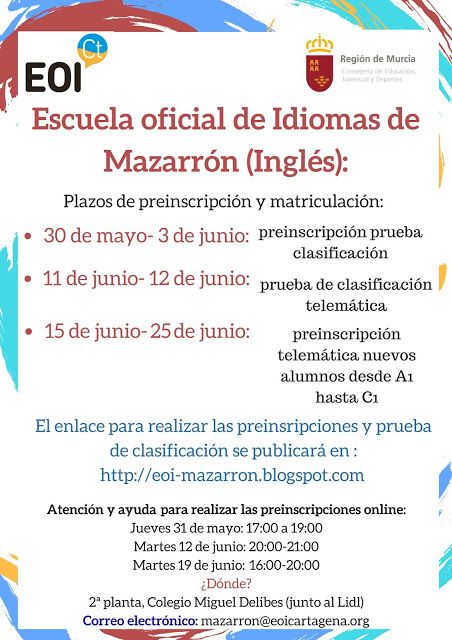 El 15 de junio se abrirá el plazo de preinscripción global hasta el 25 de junio. Según informan sus responsables, se ofertará inglés en los niveles A1, A2, B1, B2, B2.1, B2.2 y C1. Más información en: http://eoi-mazarron.blogspot.com.es/2018/05/admision-nuevos-alumnos.html