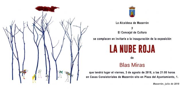 La Concejalía de Cultura del Ayuntamiento de Mazarrón trae esta vez a su espacio expositivo de Casas Consistoriales al artista local Blas Miras quien expondrá la muestra 'La nube roja', continuación del repertorio simbólico que ya mostró en su anterior exposición 'Como pez en el agua' y en la que los elementos abstractos volverán a estar al servicio de la fábula narrativa.