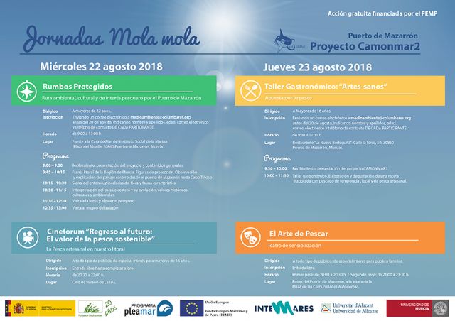 El proyecto 'Camonmar2' desembarca este miércoles y jueves en el municipio de mazarrón con cuatro actividades diferentes enmarcadas en las jornadas 'Mola, mola'. Las actividades consistirán en una Ruta Ambiental, cultural y de interés pesquero por el Puerto de Mazarrón prevista para el miércoles 22 de agosto desde las 9:00 a las 13:00 horas. Los inscritos están citados en la Casa del Mar. También el miércoles, el Cine de Verano de la Playa de la Isla proyectará un documental titulado 'Regreso al futuro: El valor de la pesca sostenible'. La proyección comenzará a las 20:30 horas.