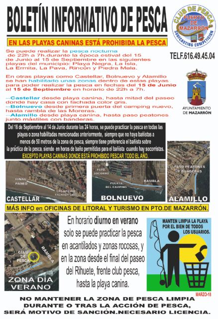 El Boletín informativo creado para este verano por el Club de Pesca de Puerto de Mazarrón, en colaboración con el Ayuntamiento, recuerda que el 15 de septiembre entra en vigor el nuevo periodo que marca la normativa para la práctica de la actividad.