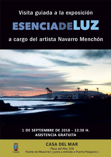 El artista Antonio Navarro Menchón ofrece este sábado 1 de septiembre (12:30 horas) una visita guiada a su exposición 'Esencia de Luz' que alberga la Casa del Mar junto a la entrada del muelle pesquero de Puerto de Mazarrón. La actividad, organizada por la Concejalía de Cultura del Ayuntamiento de Mazarrón, es de asistencia gratuita.