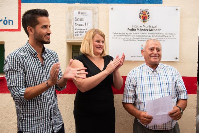 Los momentos previos al segundo partido en casa de la temporada del Mazarrón FC tras su regreso a Tercera División se vivieron este domingo de forma especial. La alcaldesa de Mazarrón, Alicia Jiménez, descubría junto a Pedro Méndez la placa que muestra la nueva denominación del Estadio Municipal que, tras acuerdo unánime en el Pleno Ordinario del pasado mes de junio, pasó a llamarse 'Estadio Municipal Pedro Méndez Méndez'.