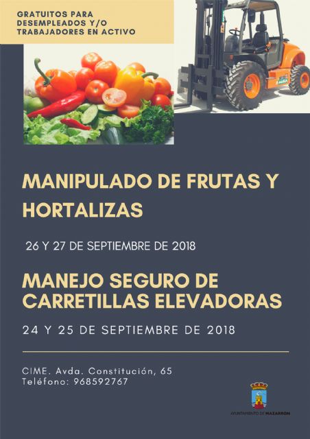 Curso de Manejo Seguro de Carretillas ElevadorasSe realizará el 24 de septiembre de 17:00 a 22:00 horas y el 25 de septiembre de 9:00 a 14:00.Curso de Manipulado de Frutas y Hortalizas.Se impartirá los días 26 y 27 de septiembre de 9:00 a 14:00 horas.Estas actividades formativas están dirigidas a desempleados y/o trabajadores activos del sector agrario.