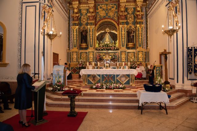 Alicia Jiménez entregó, como manda la tradición, el bastón de mando a la Patrona Seguidamente y tras la bendición del aceite de la lámpara de la Virgen tuvo lugar la procesión con la imagen de la Purísima Concepción de Bolnuevo desde el Santuario hasta la iglesia de San Andrés, donde se procedió a una ofrenda floral.