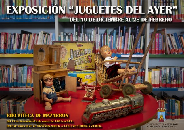 La Biblioteca Municipal de Mazarrón, ubicada en el Centro Cultural, expone desde este miércoles una colección de juguetes antiguos gracias a la colaboración de particulares y socios lectores. La muestra, titulada 'Juguetes del ayer', podrá verse hasta el 28 de febrero. Primero, durante el periodo navideño, en horario de 9:00 a 14:00 horas y tras las fiestas de 9:00 a 14:00 horas y de 16:00 a 21:00 horas.