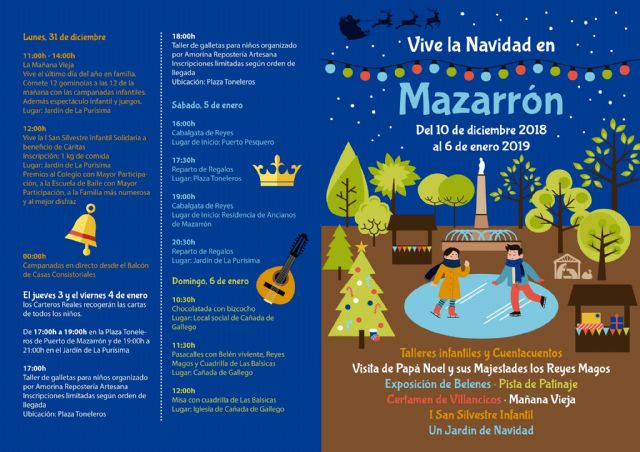 Alicia Jiménez ha destacado la colaboración de asociaciones, particulares, comercios y entidades que junto al Ayuntamiento desean cumplir el objetivo de atraer a los mazarroneros durante estas fiestas con eventos atractivos dirigidos a los niños como principales protagonistas de las fiestas navideñas. A la tradicional visita de Papá Noel y la Cabalgata de Reyes se suman actividades novedosas como la I San Silvestre Infantil, o los talleres de galletas, así como otras incorporadas recientemente como la Mañana Vieja con las 12 gominolas o la ruta del belén. Habrá actuaciones de la rondalla, cante de villancicos, cuentacuentos y talleres en las bibliotecas y una interesante exposición dedicada a juguetes antiguos. La programación religiosa con las tradicionales misas de Pascua y de Gallo se unen a un calendario para vivir en familia.