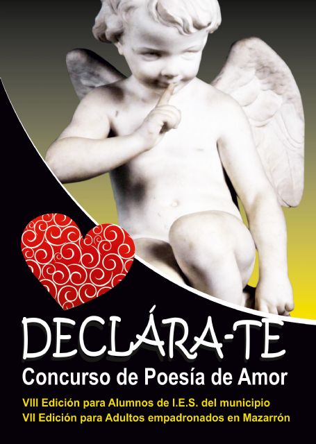 Las almas inquietas y creativas del municipio tienen una nueva cita en la que expresar su inspiración. Vuelve una nueva edición del Concurso de Poemas de Amor 'Declárate' organizada por la Concejalía de Bibliotecas y dirigida a los alumnos de los IES del Municipio y a adultos empadronados en Mazarrón.