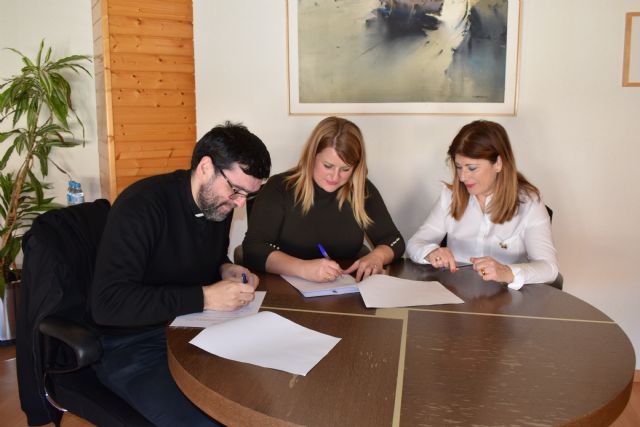 La alcaldesa Alicia Jiménez ha firmado hoy con el párroco de Puerto de Mazarrón, Juan José Noguera, el convenio de subvención anual a Cáritas para colaborar con esta asociación en la ayuda social que presta a familias de la localidad