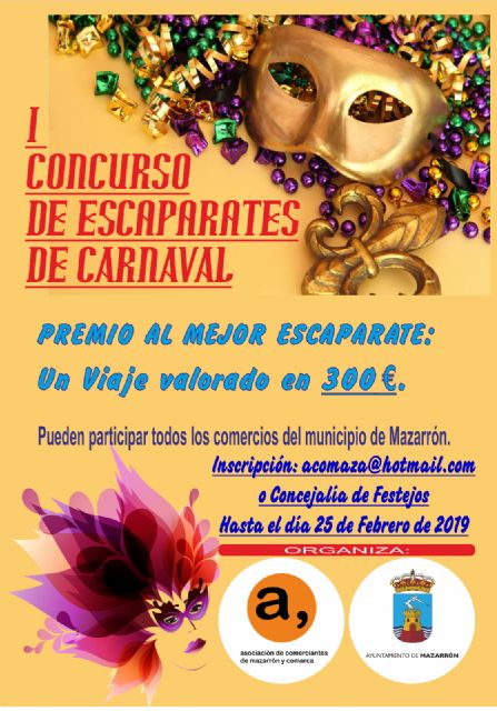 La Asociación de Comerciantes de Mazarrón y Comarca (ACOMA) y las Concejalías de Festejos y Comercio del Ayuntamiento de Mazarrón han organizado el I Concurso de Escaparates de Carnaval. La iniciativa pretende ambientar las calles del municipio coincidiendo con la celebración de los actos programados con motivo de los festejos de Carnaval. La actividad ha sido presentada por los ediles Patricio Sánchez y Marisol Vivancos junto a Francisca Madrid, tesorera y portavoz de ACOMA.
