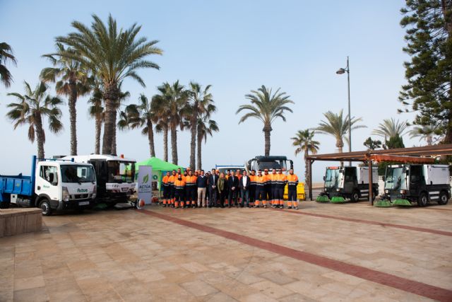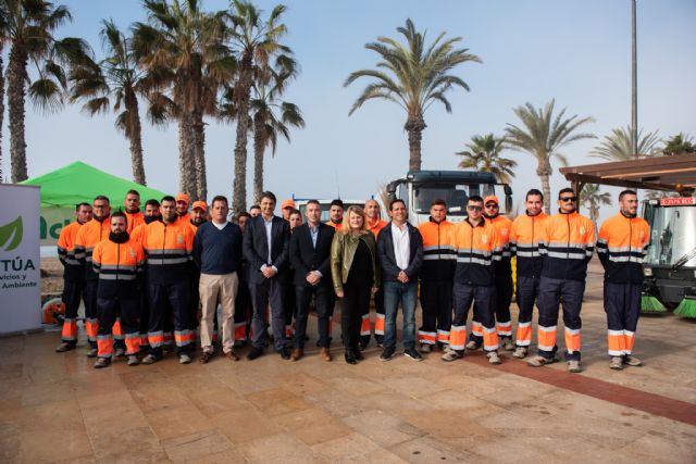 La alcaldesa de Mazarrón, Alicia Jiménez y el concejal de Servicios, Domingo Hernández, han presentado el nuevo contrato de limpieza firmado por la empresa municipal Bahía de Mazarrón que inició su actividad el pasado 1 de marzo. Alcaldesa y concejal han comprobado in situ en el despliegue humano y técnico de un nuevo servicio que refuerza al actual. 22 personas, 3 máquinas barredoras, un camión de baldeo, otro recogedor de bolsas y carritos de limpieza reforzarán en invierno el servicio de limpieza que lleva a cabo en el municipio el Ayuntamiento de Mazarrón.