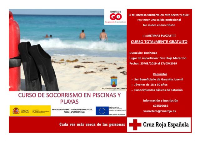 Cruz Roja Española con la colaboración del Ayuntamiento de Mazarrón impartirá en Mazarrón del 25 de marzo al 17 de mayo un Curso de Socorrismo en Playas y Piscinas. Se trata de una actividad gratuita de 180 horas de duración que tendrá lugar en la sede de Cruz Roja en Mazarrón.