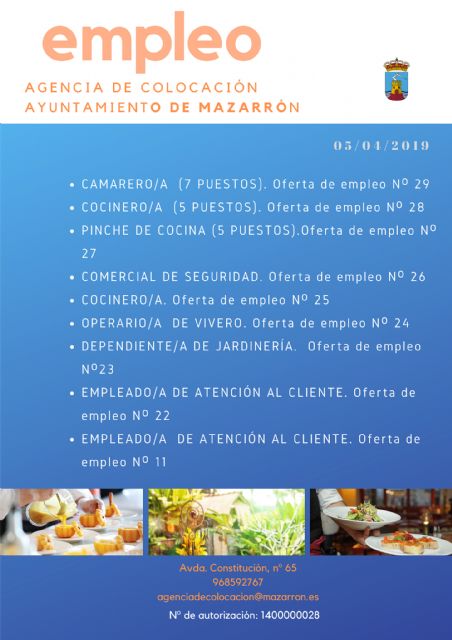 La Agencia de Empleo del Ayuntamiento de Mazarrón notifica la existencia de nuevas ofertas de empleo para cubrir 7 puestos de camarero, 6 de cocinero, 5 de pinche de cocina, 1 comercial de seguridad, 1 cocinero, 1 operario de vivero, 1 dependiente de jardinería y 2 empleados de atención al cliente.