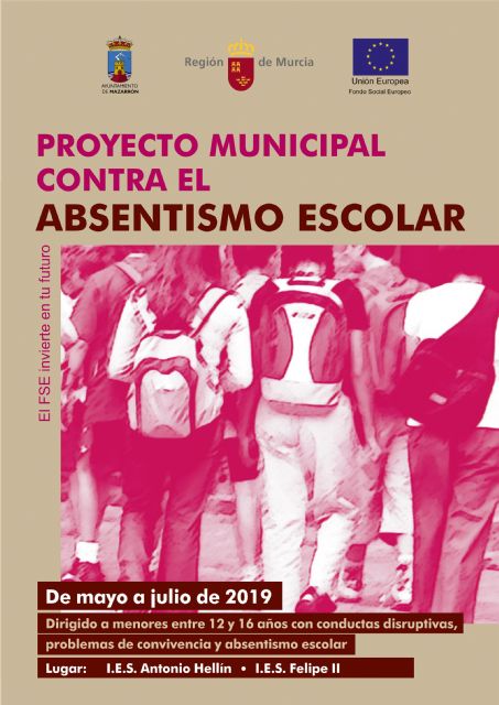 Durante estos meses se lleva a cabo en Mazarrón un Proyecto Municipal contra el Absentismo Escolar. Está dirigido a menores entre 12 y 16 años y se realiza en los IES Antonio Hellín de Puerto de Mazarrón y Felipe II de Mazarrón. El programa está financiado con fondos de la Unión Europea, por importe de 7.826 € a través de la Dirección General de Atención a la Diversidad y Calidad Educativa.