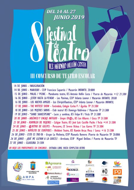 El certamen, con el que también colaboran un importante grupo de patrocinadores, se extiende del 14 al 27 de junio y este año cuenta con un cartel de grupos escolares de Educación Primaria y Secundaria procedentes de diversos puntos de la Región de Murcia: Águilas, Lorca, Los Garres, Cieza, Yecla, Mazarrón y Puerto de Mazarrón. Esta muestra de teatro escolar, único en la Región de Murcia, cuenta con obras de teatro para público infantil que concurren en fase de exhibición y obras de grupos juveniles de institutos de Educación Secundaria tanto en fase de concurso como en fase de exhibición.
