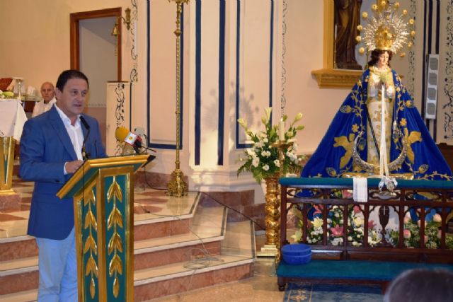 El alcalde de Mazarrón, Gaspar Miras, se congratuló de que "nuestra madre está ya con nosotros. Qué grande tener fe y poder demostrarla sin miedo y sin complejos" y dio la enhorabuena "a ese querido o querida cofrade que, queriéndose mantener en el anonimato, ha sido el artífice de estas gran labor de restauración". Miras también dedicó unas palabras a Juana Toledo Navarro que, "aunque no está aquí físicamente, siempre será parte de este hermoso santuario y de su querida Archicofradía. Siempre mi reconocimiento hacia su persona". El alcalde finalizó su intervención exhortando a los mazarroneros que "el encuentro esta tarde con nuestra patrona nos mantenga en relación constante con ella hablándole, escuchándola y dándole gracias".