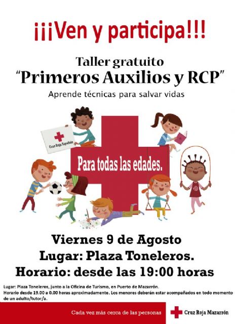 Cruz Roja Mazarrón continúa con su labor para informar a la ciudadanía sobre diferentes aspectos relacionados con la seguridad y la salud. En esta ocasión, el citado organismo realizará un taller totalmente gratuito para dar a conocer cuáles son las principales técnicas de primeros auxilios y reanimación cardio-pulmonar, así como la forma en que hay que realizarlos ante una emergencia que nos pueda surgir. El taller se realizará este viernes 9 de agosto en la plaza Toneleros de Puerto de Mazarrón a partir de las 7 de la tarde, donde pueden acudir libremente todos los ciudadanos que deseen aprender estas técnicas.