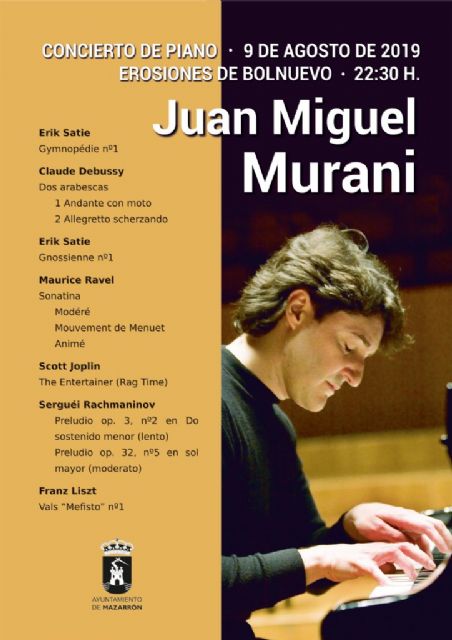 Juan Miguel Murani agradeció a la concejalía de Cultura esta apuesta por la música clásica y dio cuenta del repertorio que interpretará al piano. Un programa "diferente como siempre al de otros años para que no se repita nada y que también haya diferentes estilos". El programa de este año "está compuesto por composiciones de finales del siglo XIX y siglo XX de autores como Satie, Debussy, Ravel, Joplin, Rachmaninov y Liszt" explicó el intérprete.