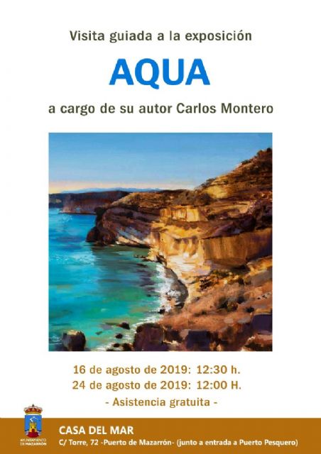 La concejalía de Cultura del Ayuntamiento de Mazarrón ha programado dos visitas guiadas a la exposición 'Aqua' de Carlos Montero que hasta el 1 de septiembre puede visitarse en La Casa del Mar de Puerto de Mazarrón. El propio Carlos Montero será el encargado de explicar a los asistentes la temática y técnica llevada a cabo en sus obras.
