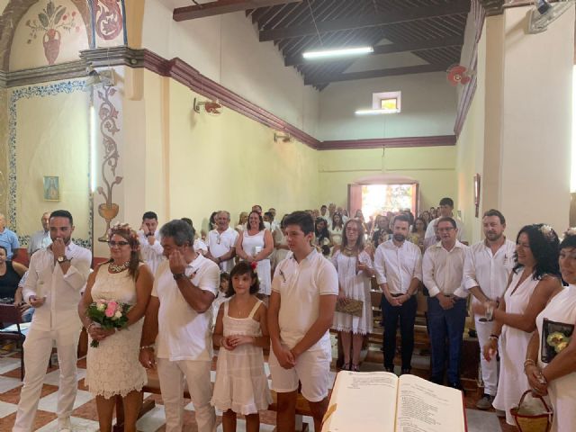 Especialmente emotiva fue este año la celebración de la misa en honor al patrón ya que, durante la misma, se conmemoraron las bodas de plata los vecinos de la pedanía Juan Méndez y Maribel Lara. Además de por familiares y amigos, la pareja estuvo arropada por el alcalde de Mazarrón, Gaspar Miras, el concejal de Festejos, Miguel Ángel Peña y la concejala de Educación, Conchi Aparicio. Tras la ceremonia, todos compartieron un agradable rato de convivencia antes de celebrar la ya tradicional 'Fiesta Blanca'.