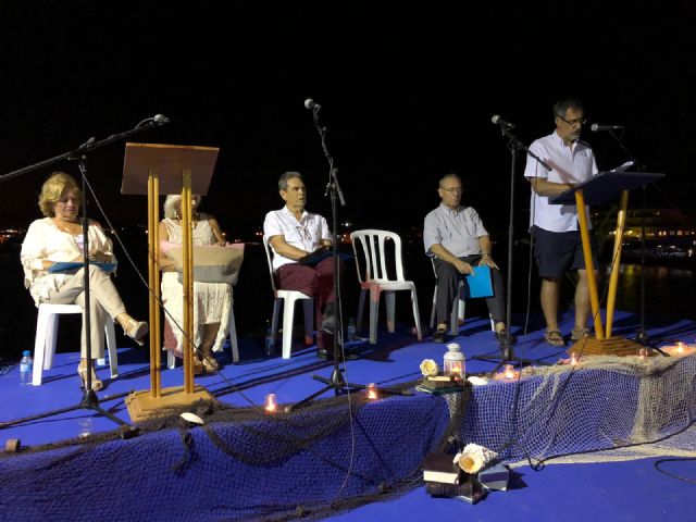 Puerto de Mazarrón vivió el pasado viernes un mágico encuentro con la poesía gracias a la celebración de una nueva cita con la actividad 'Mares de Papel' que organiza la concejalía de Archivo y Bibliotecas. El primer teniente de alcalde y concejal de Cultura, Ginés Campillo, la concejala de Archivo y Bibliotecas, Conchi Aparicio, y el concejal de Servicios, Tomás Ureña, estuvieron presentes arropando a los participantes de esta edición.