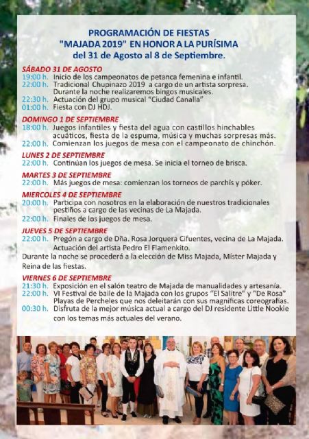 El jueves 5 comienza el grueso de la programación con el pregón de las fiestas a cargo de Rosa Jorquera, vecina de la pedanía. La noche contará con la actuación de Pedro 'El Flamenkito' y, durante la misma, se procederá a la elección de Miss Majada, Míster Majada y Reina de las Fiestas.