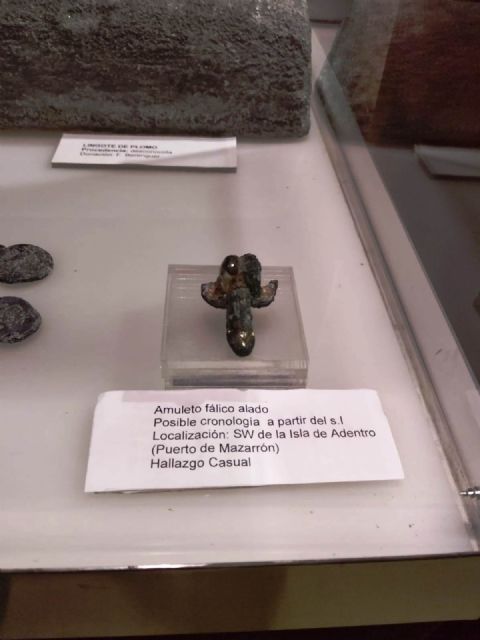 Pero también están produciéndose hallazgos pertenecientes a otras civilizaciones como la romana. En concreto, en uno de los bautismos de buceo realizados por el Centro de buceo del Sureste 'Bachisub', ha aparecido un amuleto romano en forma de falo alado que dataría del siglo I d.C. que ha sido entregado al Ayuntamiento por el director del citado centro, Alfonso Bachiller.