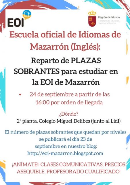 Este martes 24 de septiembre, se va a proceder a repartir las plazas sobrantes de la Escuela Oficial de Idiomas de Mazarrón del idioma de Inglés. Será a partir de las cuatro de la tarde en la segunda planta del IES Miguel Delibes de Puerto de Mazarrón y, como es habitual, las plazas se adjudicarán por orden de llegada de los interesados al centro.