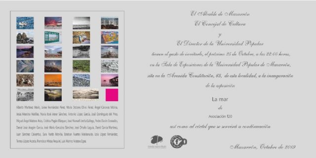 La Asociación de Fotógrafos F 20, compuesta en su mayoría por fotógrafos mazarroneros, es el colectivo autor de la muestra 'La Mar' que este viernes 25 de octubre se inaugura con entrada libre a partir de las 10 de la noche en la sala de exposiciones del CIME, situada en la planta baja del citado edificio en la avenida Constitución número 65 de Mazarrón.