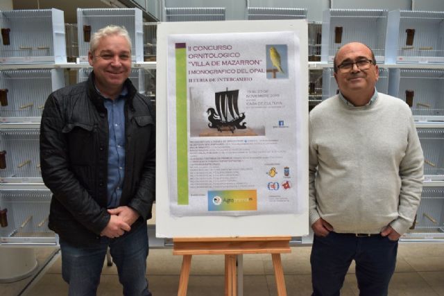 Desde hoy y hasta el próximo 23 de noviembre, se celebra en el Centro Cultural de Mazarrón el II Concurso Ornitológico 'Villa de Mazarrón' que organiza la Asociación Cultural Ornitológica de Mazarrón (ACOM) con la colaboración de la concejalía de Cultura. El edil del área, Ginés Campillo, y el presidente de la citada asociación, Francisco Aznar, han detallado los pormenores de este encuentro que, además de ser la segunda feria de intercambio para profesionales y aficionados del sector, es el I Monográfico sobre el Opal (Canario).