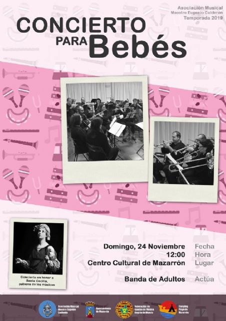 El primer concierto, dirigido a bebés, tendrá lugar el domingo día 24 de noviembre a las doce de mediodía en el Centro Cultural de Mazarrón. El concierto de bebés correrá a cargo de la banda de adultos y será un concierto interactivo donde los pequeños acompañados por sus papás y mamás participarán con movimientos o acompañamiento de pequeña percusión en las distintas piezas musicales.