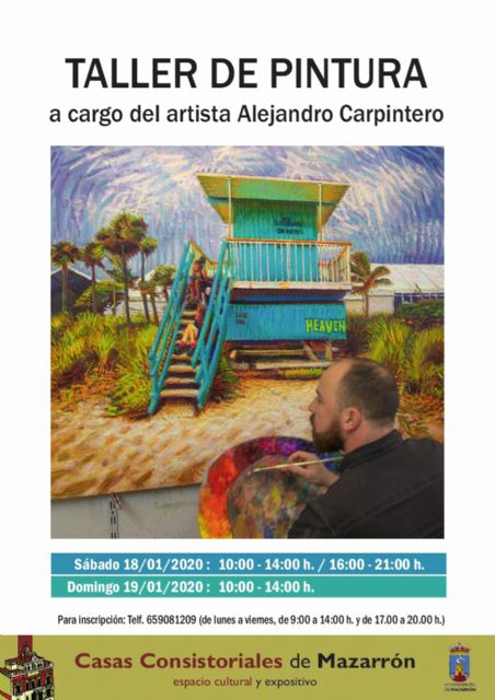 El artista madrileño Alejandro Carpintero, quien deslumbró este pasado verano con su exposición pictórica titulada 'El Verano Precintado', regresa al municipio para, en esta ocasión, impartir un taller de pintura. Durante la actividad, que se desarrollará el sábado 18 de enero de 10 a 14 y de 16 a 21 horas y el domingo 19 de 10 a 14 horas, Carpintero realizará diversas demostraciones que le permitirán mostrar y compartir sus conocimientos con los participantes. Además, guiará y acompañará a los asistentes en la creación de su propia obra durante todo el taller.