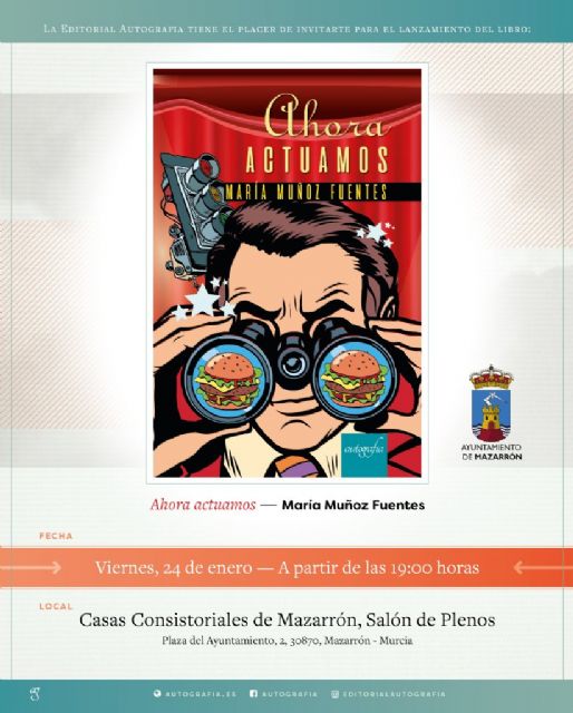El Salón de Plenos de Casas Consistoriales acogerá este viernes la presentación del libro de la mazarronera María Muñoz titulado 'Ahora actuamos'. La presentación correrá a cargo del concejal de Cultura, Ginés Campillo, y de la propia autora, quien es natural de la pedanía de La Atalaya.