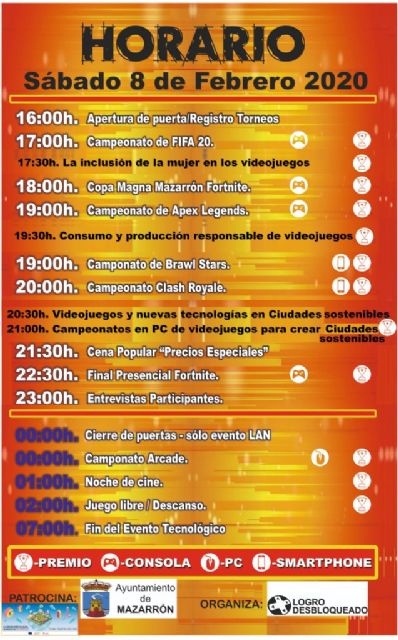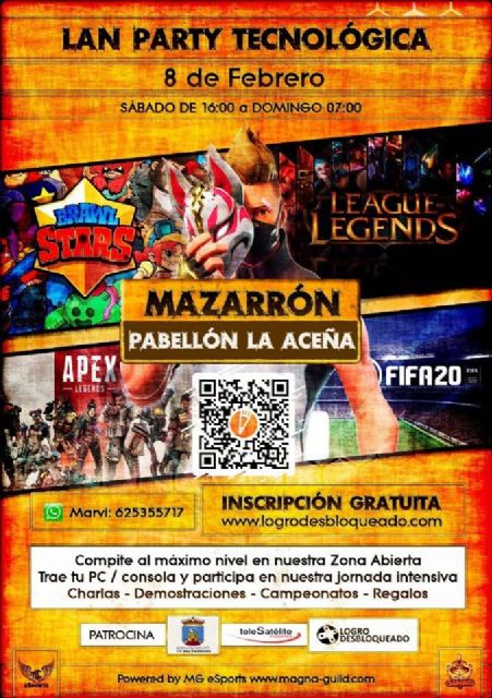 Este sábado 8 de febrero, el pabellón de deportes de 'La Aceña' acoge el I Evento Tecnológico LAN PARTY Mazarrón que se celebrará a partir de las 4 de la tarde. La iniciativa de la concejalía de Juventud tiene una doble vertiente. Por un lado, la parte lúdica contará con una zona de videojuegos y una zona LAN de ordenadores que contará con señal de Internet de alta velocidad por fibra óptica gracias la empresa local 'Telesatélite Mazarrón' que cederá la señal de manera gratuita.