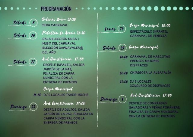 Los días 22 y 23 de febrero tendrán lugar los desfiles Infantil y de Adultos respectivamente, con salida ambos a las 5 de la tarde desde el Jardín de La Paz. El lunes 24 se celebra una de las novedades con un espectáculo infantil sobre el Carnaval de Venecia en la carpa municipal a las 6 de la tarde. El sábado 29 llegan más novedades como el I Carnaval de Mascotas, organizado junto a la concejalía de Bienestar Animal, también en la carpa municipal a las 6 de la tarde.