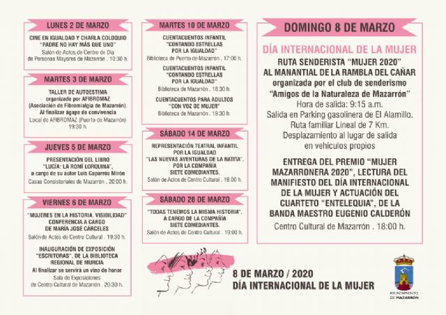 Por su parte, el concejal de Igualdad y Mujer, Miguel Ángel Peña, ha recordado que, durante el mes de marzo, se llevarán a cabo diferentes actividades con motivo del 'Mes de la Mujer', cuyo acto central tendrá lugar el domingo 8 de marzo con la entrega del galardón de este año en el Centro Cultural a partir de las 6 de la tarde. Cine, talleres, teatro, cuentacuentos, conferencia, presentación de un libro e incluso una exposición componen una amplia programación dirigida a todos los públicos.
